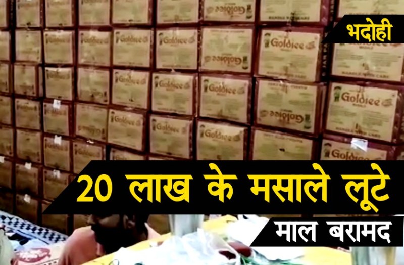 भदोही. बीती रात वाराणसी से लूटा गया 20 लाख रपये का गोल्डी मसाला ट्रक समेत पुलिस ने भदोही से बरामद कर लिया। पुलिस ने लूट का 1400 पेटी गोल्डी मसाला बरामद कर लिया है। ट्रक में लदा मसाला पुलिस ने एक घर से बरामद किया और खाली ट्रक भी मिल गया।
