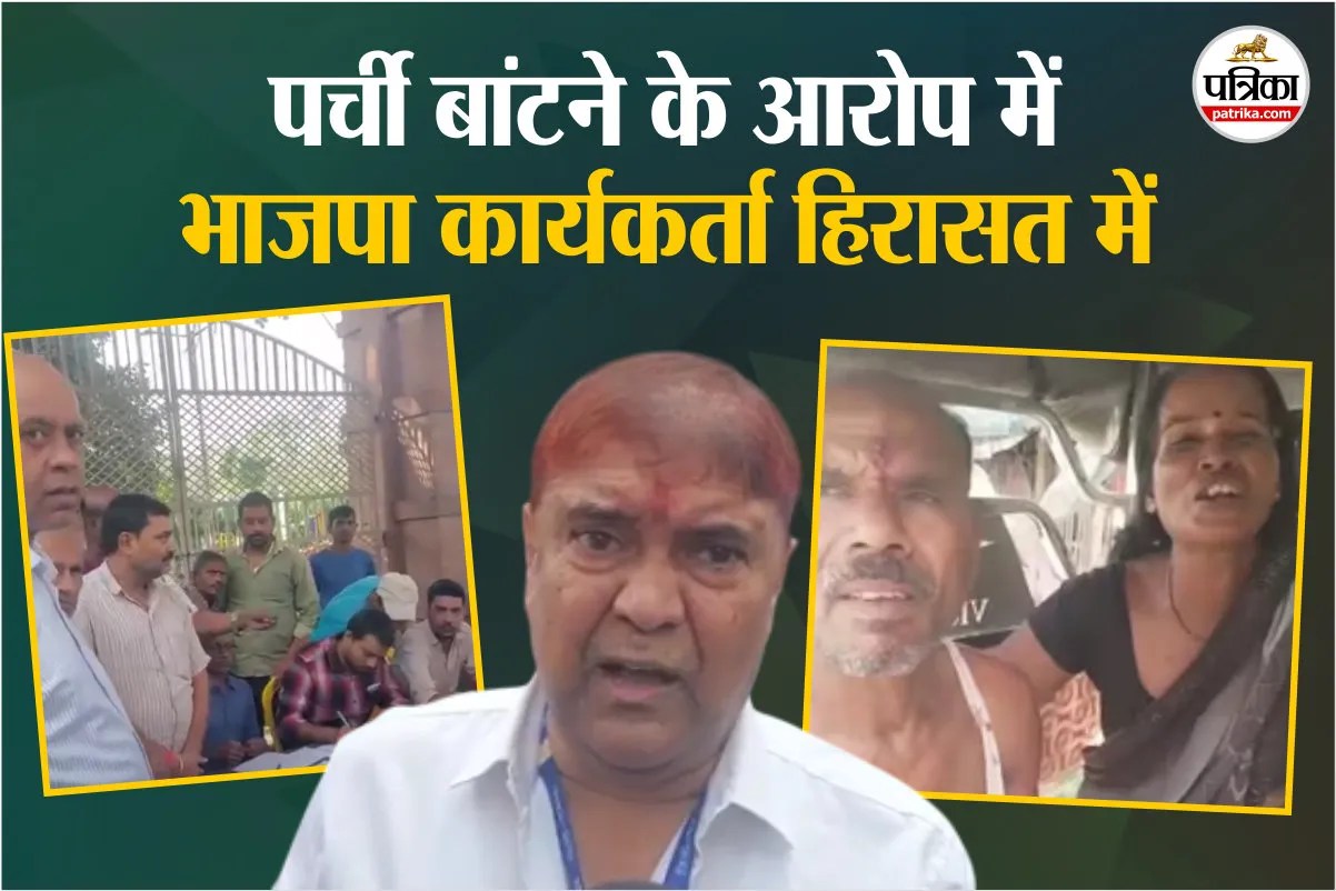 पर्ची बांटने के आरोप में भाजपा कार्यकर्ता हिरासत में (फोटो- पत्रिका ग्राफिक्स)