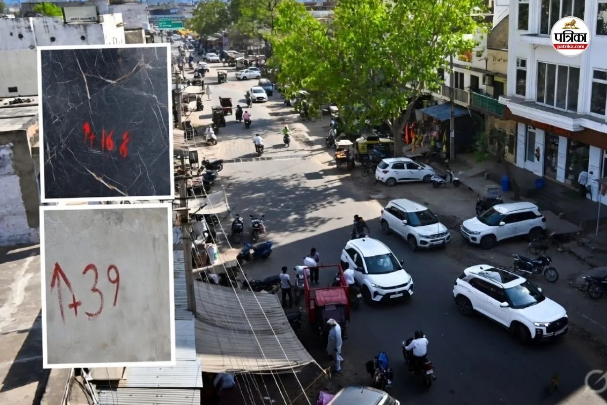 भरतपुर शहर के रेडक्रास सर्किल से रेलवे स्टेशन तक सड़क और लाल निशान लगे प्रतिष्ठान। फोटो पत्रिका
