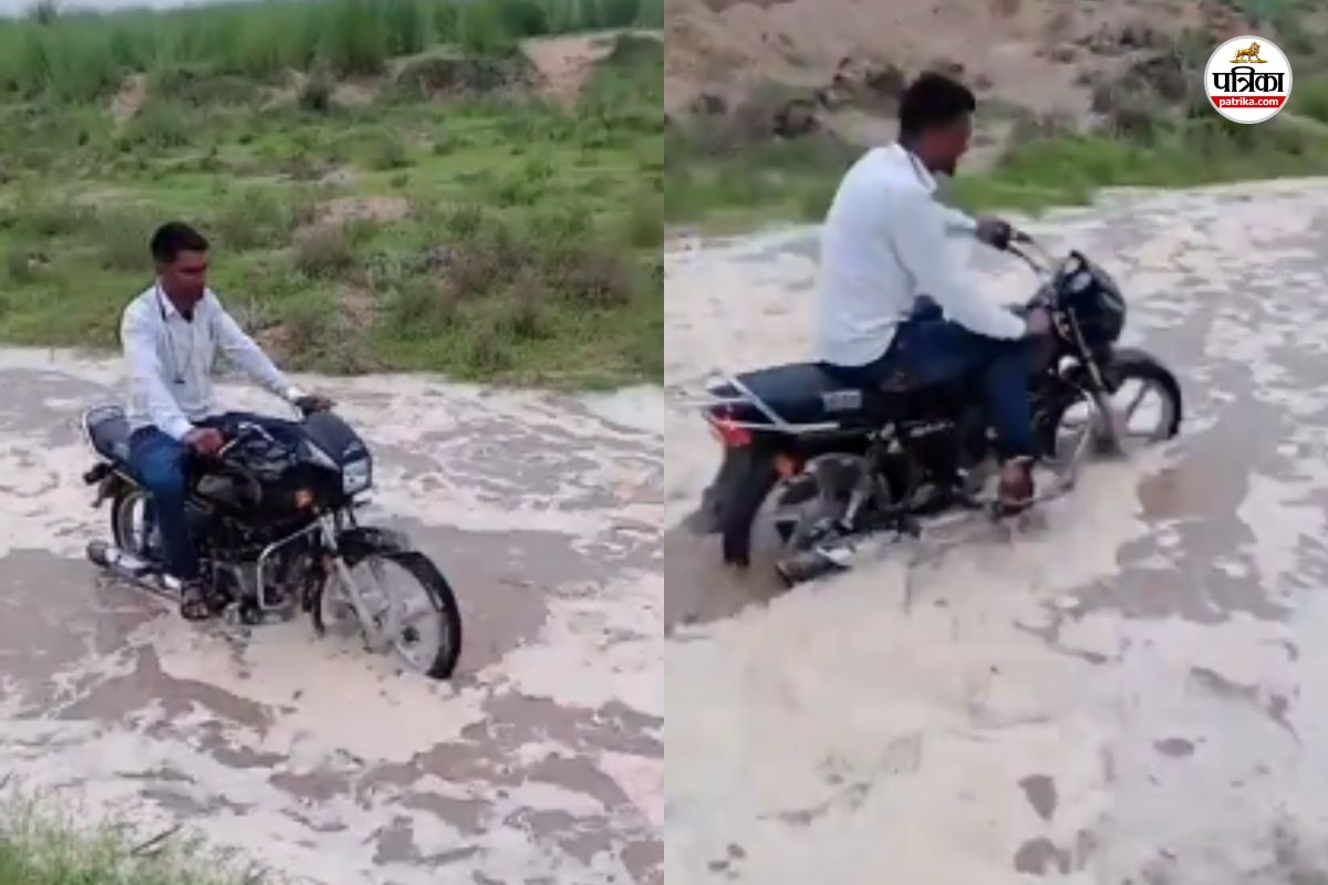नदी में बाइक चलाता युवक। फोटो: पत्रिका