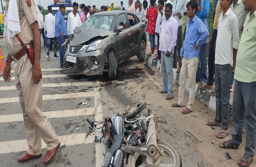 भरतपुर. रूपवास कस्बे में भरतपुर-धौलपुर मार्ग स्थित बाइपास पर रविवार शाम भीषण सड़क हादसे में बाइक सवार दंपती व छह माह के बच्चे की मौके पर ही मौत हो गई। हादसा तेज रफ्तार कार से हुआ। दुर्घटना के समय बाइक कुछ दूरी तक घसीटते हुए चली गई। हादसा इतना जबरदस्त था कि बाइक पूरी तरह क्षतिग्रस्त हो गई और कार का बंपर व बोनट टूट गया। सूचना पर पुलिस मौके पर पहुंची और शवों को कब्जे में लेकर रूपवास अस्पताल की मोर्चरी में भिजवाया। हादसे की सूचना मिलने पर परिजनों को रो-रो कर बुरा हाल था और लोग उन्हें सांत्वना दे रहे थे।