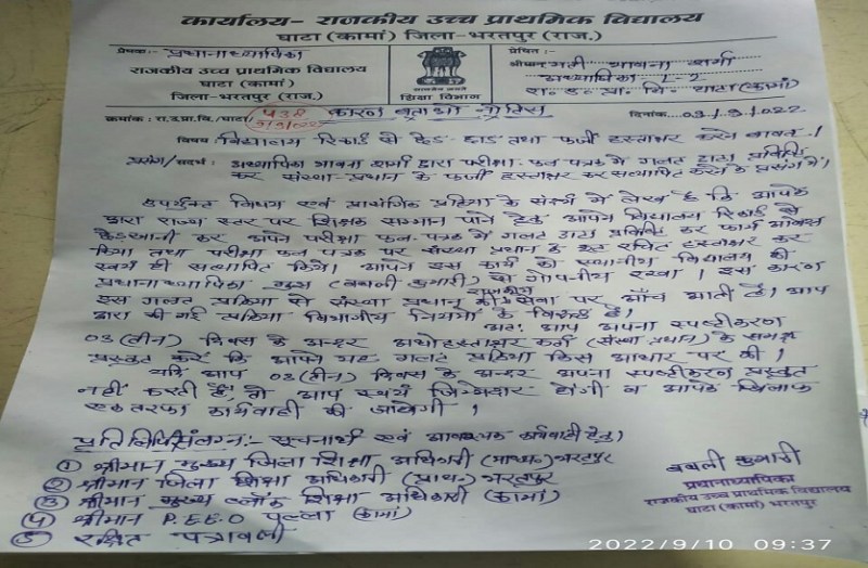 नोटिस के अनुसार विद्यालय में कार्यरत शिक्षिका भावना शर्मा की ओर से विद्यालय के परीक्षा फल पत्रक में गलत डाटा प्रविष्टि कर अपना परीक्षा परिणाम उत्कृष्ट दर्शा दिया। इन्हीं गलत प्रविष्टियों और उत्कृष्ट परिणाम के आधार पर उनका चयन राज्य स्तरीय शिक्षक सम्मान के लिए हुआ। कारण बताओ नोटिस में उल्लेख है कि भावना शर्मा की ओर से परीक्षा फल पत्रक पर संस्था प्रधान बबली कुमारी के कूट रचित हस्ताक्षर कर स्वयं ही रिकॉर्ड में किए गए फेरबदल को सत्यापित भी कर दिया। शिक्षिका भावना शर्मा से तीन दिन में जबाव मांगा गया है।