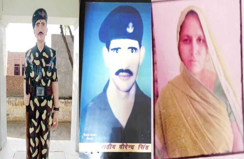 भरतपुर. 1999 में करगिल युद्ध में शहीद हुए वीरेंदर सिंह अपने पीछे उस समय पत्नी गायत्री देवी और डेढ़ वर्षीय पुत्री ज्योति और तीन वर्षीय पुत्र चंद्रभान सिंह को छोड़ गए थे। पति की शहादत के बाद वीरांगना गायत्री देवी शहीद पति की अर्थी को कंधा देते हुए शमशान तक पहुंची थी, वह प्रदेश की ऐसी पहली वीरांगना थी, जिन्होंने शहीद पति को कंधा दिया था।