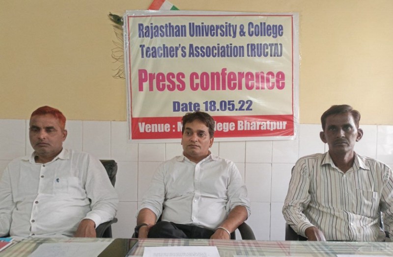 एमएसजे कॉलेज के राजनीति विज्ञान विभाग में हुई प्रेस कॉफ्रेंस में प्रांतीय कार्यकारिणी सदस्य प्रो. अरविंद वर्मा ने कहा कि संगठन के शैक्षिक क्षेत्रीय अधिवेशन के लिए दूरभाष पर प्राचार्य परमजीत एवं कार्यवाहक प्राचार्य ओम प्रकाश सोलंकी से 14 मई को सैद्धांतिक सहमति प्राप्त करने के पश्चात 15 मई को प्राचार्य एमएसजे कॉलेज को संबोधित ईमेल से अधिवेशन के लिए अनुमति मांगी थी, लेकिन राज्यमंत्री डॉ. सुभाष गर्ग ने एक से अधिक बार प्राचार्य को फोन करके दबाव बनाया और अनुमति से इंकार करने के लिए आदेशित किया, इनकी मिलीभगत का प्रत्यक्ष प्रमाण यह है कि प्राचार्य की ओर से लिखा गया पत्र प्रेस की ओर से छपने से पहले सोशल मीडिया पर प्रचारित और प्रसारित कर दिया गया। इस मामले में डॉ. सुभाष गर्ग की ओर से अति सक्रियता दिखाने का कारण यह है कि वे संगठन में आरोपित शिक्षकों को सह दे रहे हैं। उन्होंने कहा कि डॉ. प्रदीप पाराशर को सन् 2007 में देरा श्री प्रभारी के पद पर लिखित आदेश से तत्कालीन महामंत्री डॉ. सुभाष गर्ग ने ही नियुक्त किया था, तब से लेकर सन 2021 तक प्रदीप पाराशर देरा श्री प्रभारी रहे थे। प्रदीप पाराशर रीट प्रकरण के भ्रष्टाचार में गिरफ्तार रहने के बाद हाइकोर्ट से जमानत पर छूटे हैं। संगठन की ओर से विधिवत तरीके से निकाले जाने से क्षुब्ध होकर एक मार्च को इस असंतुष्ट समूह ने फर्जकारी एवं कूटरचित दस्तावेजों के सहारे संगठन बनाने की घोषणा कर दी। घासीराम चौधरी के निर्वाचन संबंधी पत्र के साथ शिक्षकों के फर्जी हस्ताक्षर युक्त दस्तावेज प्रयोग में लाए गए और हस्ताक्षरों के एक ही हूबहू सेट को दोनों प्रस्तावों के साथ लगाकर न सिर्फ संगठन बनाने की घोषणा की अपितु पंजीयन कार्यालय में पंजीयन भी करा लिया गया। जबकि प्रस्ताव के समर्थन में प्रस्तुत हस्ताक्षरों में स्कूल शिक्षक, आर्मी मेन, ठेकेदार, सेवानिवृत्त शिक्षकों के भी हस्ताक्षर लिए गए थे जो पूर्णत: अवैध है।