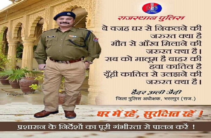 पुलिस ने सोशल मीडिया पर दिशा-निर्देश के साथ लोगों को बेवजह घर से नहीं निकलने की शायराना अंदाज में समझा रही है। गुरुवार को पुलिस अधीक्षक कार्यालय की ओर से सोशल मीडिया में पोस्टर जारी किया। इसमें लोगों से कहा कि बे-वजह घर से निकलने की जरुरत क्या है, मौत से आंख मिलाने की जरुरत क्या है। सब को मालूम है बाहर की हवा कातिल है, यूं ही कातिल से उलझने की जरुरत क्या है...। इससे पहले 8 अप्रेल को शब्बे-ए-बारात पर मुस्लिम समाज के लोगों को घर पर रहने का आह्वान किया गया। वहीं, 9 और 11 अप्रेल को भी लोगों को सलाह देते हुए संदेश दिए। इसके अलावा जिला प्रशासन की ओर से उठाए जा रहे कदमों की जानकारी भी दी जा रही है।