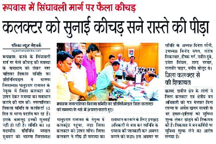 सिंघावली मार्ग पर फैले कीचड़ की समस्या को लेकर नगर पालिका विकास समिति की आवाज को राजस्थान पत्रिका ने लगातार खबरों का प्रकाशन कर बुलंद किया। समिति के सदस्यों ने इस मामले को लेकर क्षेत्रीय विधायक से भी मुलाकात की थी। 23 जून को 'कीचड की समस्या से आमजन परेशानÓ, 29 जून को 'नगर पालिका विकास समिति का गठनÓ, 30 जून को 'कीचड़ में खड़े हो जताई नाराजगीÓ, 1 जुलाई को 'रैली निकाल प्रदर्शन कियाÓ, 2 को 'कीचड़ की समस्या बन गई नासूरÓ 3 को 'अब विधायक से लगाई गुहारÓ, 4 को 'फोन नहीं उठाने पर विधायक ने जेईएन को लगाई फटकारÓ, 5 को 'सफाई के नाम पर खानापूर्ति, 11 को 'कार्यकर्ताओं ने जेईएन का घेराव कियाÓ 12 को 'सानिवि कार्यालय पर प्रदर्शनÓ एवं 13 जुलाई को 'कलक्टर को सुनाई कीचड़ सने रास्ते की पीड़ाÓ शीर्षक से खबरों का प्रकाशन किया था।