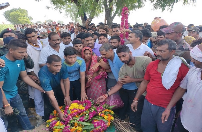 शहीद की वीरांगना सूरजमुखी, बच्चे और परिजन बिलख पड़े और परिजन शहीद की देह से लिपट कर गए। यह दृश्य देख आसपास लोगों की आंखे नम हो गई और ग्रामीणों ने परिजनों को ढांढ़स बंधाया। शहीद को चिकित्सा राज्यमंत्री डॉ.सुभाष गर्ग, जिला कलक्टर हिमांशु गुप्ता, जिला सैनिक कल्याण बोर्ड के अधिकारी कर्नल केवीएस ठेनुआ समेत अन्य प्रशासनिक अधिकारियों ने पुष्पचक्र अर्पित कर श्रद्धांजलि दी।