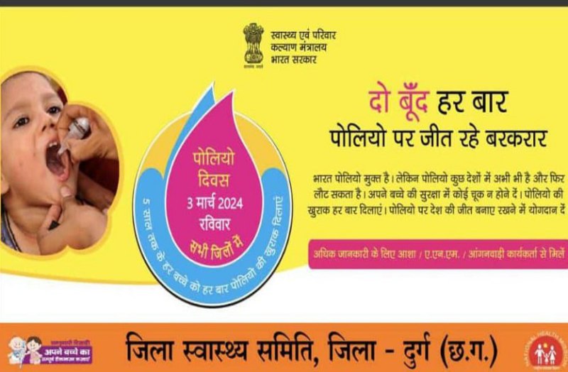 रविवार को प्रथम दिवस बूथ में 0-5 साल के बच्चों को पोलियो ड्रॉप पिलाया जावेगा। 4 व 5 मार्च 2024 को दल घरों में भ्रमण कर शेष छूटे हुए बच्चों को पोलियो की दवा पिलाकर बायें हाथ की छोटी ऊंगली में पोलियो मार्कर पेन से निशान लगाएंगें।
