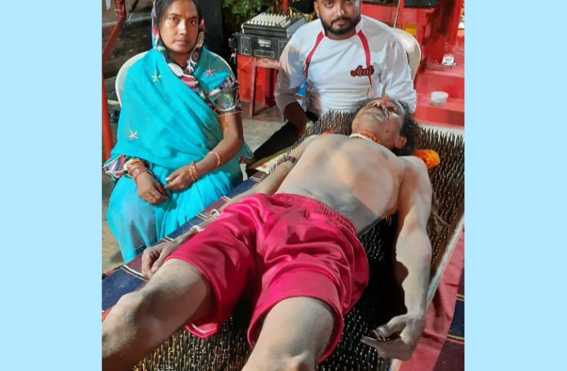 नुकीले कीले की शैया पर लेटे तपस्वी के समीप गांव के लोग एक जुट हो गए हैं। वे लगातार माता का भजन और कीर्तन कर रहे हैं। यह तप सोमवार को दोपहर 12 बजे तक जारी रहेगा। यह खबर आसपास के गांव में भी आग की तरह फैल रही है कि कोरोना के खिलाफ एक तपस्वी जो हर साल माता की पूजा अलग-अलग तरीके से करता आ रहा है, वह इस बार कीले की शैया पर लेट गए हैं। गांव में चल रहा माता का जगराता कार्यक्रम.