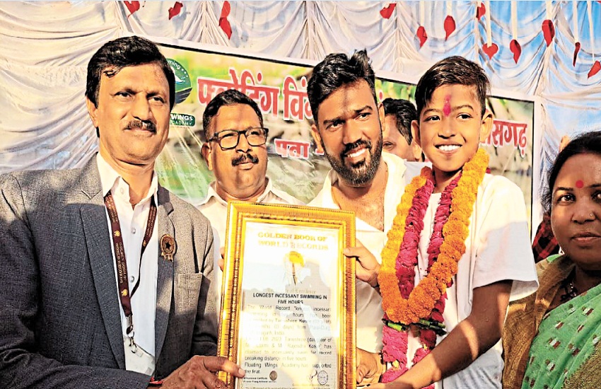 दुर्ग। Chhattisgarh News: दुर्ग जिले के खेलगांव के नाम से ख्याति प्राप्त ग्राम पुरई की एक नन्ही बच्ची ने एक नया रिकॉर्ड बनाया है। नन्ही तैराक 9 वर्षीय बालिका तनुश्री कोसरे ने लगातार बिना रुके, बिना थके 5 घंटे तक गांव के डोंगिहा तालाब में तैर कर विश्व रिकॉर्ड बनाया।