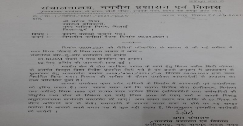 अपर संचालक, संचालनालय, नगरीय प्रशासन व विकास, रायपुर ने नगर निगम, भिलाई के स्वास्थ्य अधिकारी धर्मेंद्र मिश्रा को कारण बताओ नोटिस जारी किया है। वीडियो कॉफ्रेंसिंग के माध्यम से की गई समीक्षा में निम्न तथ्य संज्ञान में आया। सेग्रीगेटेड डोर टू डोर कलेक्शन का अभाव है। इसमें पहला एसएलआरएम सेंटरों में वेस्ट प्रोसेसिंग का अभाव। दूसरा वेस्ट डम्पिंग की जानकारी मिली। 7 दिनों के भीतर इस नोटिस का उनको जवाब देना है, वर्ना उनके खिलाफ एकतरफा कार्रवाई कर दी जाएगी।