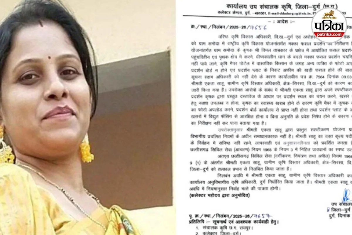उप संचालक कृषि द्वारा जारी आदेश में कहा गया है कि यह कृत्य छत्तीसगढ़ सिविल सेवा (आचरण) नियम, 1965 का उल्लंघन है। छग सिविल सेवा (वर्गीकरण, नियंत्रण एवं अपील) नियम, 1966 के तहत एकता साहू को निलंबित किया गया है। उनका मुख्यालय अनुविभागीय कृषि अधिकारी कार्यालय रहेगा।