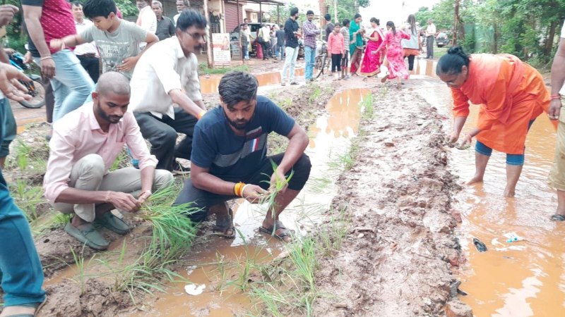 देखो.. अनोखा प्रदर्शन, Bhilai भाजयुमो ने खराब सड़कों पर रोपा धान