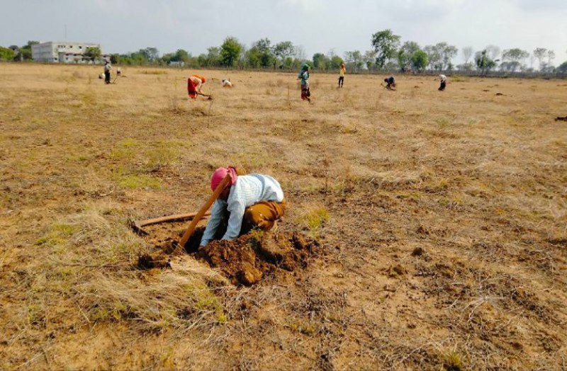 नंदिनी की निष्प्रयोज्य माइंस में सूखे चुके पौधों के स्थान पर नए पौधे रोपने के लिए गड्ढा खोदती महिला श्रमिक : फोटो गोकरण निषाद