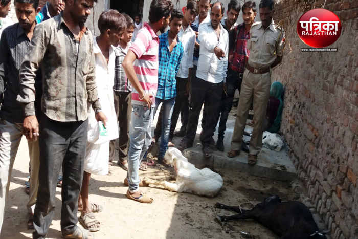 आसोप गांव में पेट में कीड़े मारने की दवा से बिगड़ी हालत से दजर्नभर बकरियों की मौत के बाद मौके पर जमा लोग