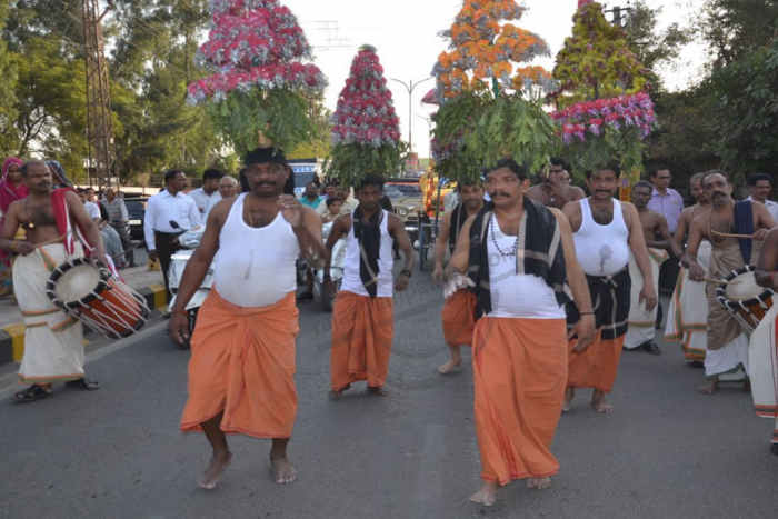 वाद्य यंत्रों के साथ परम्परागत चेण्डामेलम और सिर पर फूलों से सजा कलश लिए अम्मकुडम नृत्य करते केरल के कलाकार।