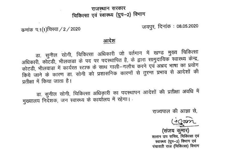 कोटडी मुख्यालय पर कार्यरत सीएससी पर मुख्य ब्लॉक चिकित्सा अधिकारी डॉ. सुनील सोनी को शुक्रवार को चिकित्सा एवं स्वास्थ्य विभाग के शासन उफ सचिव संजय कुमार ने आदेश जारी कर एपीओ कर दिया। सोनी का मुख्यालय जयपुर कर दिया है। सोनी पर 2 दिन पूर्व चिकित्सा स्टाफ कर्मियों को गाली गलोज व अभद्र भाषा का प्रयोग करने, धमकिया देने का आरोप लगाते हुए तीनों कार्मिकों ने थाने पर मुकदमा दर्ज कराया था। सोनी के ऑडियो वायरल हुआ। इसमें डॉक्टर सोनी ने विधायक रामलाल जाट व रीटा चौधरी पर भी अभद्र भाषा का प्रयोग किया।