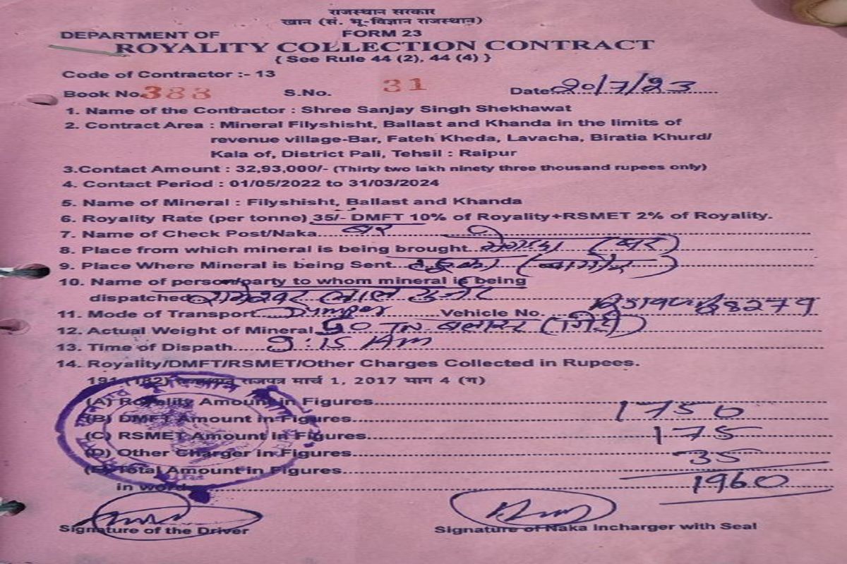 Bhilwara news : खनिज विभाग भीलवाड़ा में रॉयल्टी पर्ची के गड़बड़झाले के मामले में नया खुलासा हुआ है। खनिज विभाग के अधीक्षण अभियन्ता कार्यालय में कार्यरत पूर्व कर्मचारी के साथ अन्य व्यक्ति काम करता था। इस कर्मचारी के साथ ठेकेदार भी था। ये दोनों सार्वजनिक निर्माण विभाग के काम करने वाले ठेकेदारों को 30 रुपए प्रति टन के आधार पर रॉयल्टी पर्ची उपलब्ध करवाते थे। उसके बाद भी ठेकेदार को 10 रुपए प्रति टन की बचत होती थी। इस लालच में ठेकेदार फर्जी रवन्ना या रॉयल्टी पर्ची खनिज विभाग में एनओसी के लिए पेश करते है।