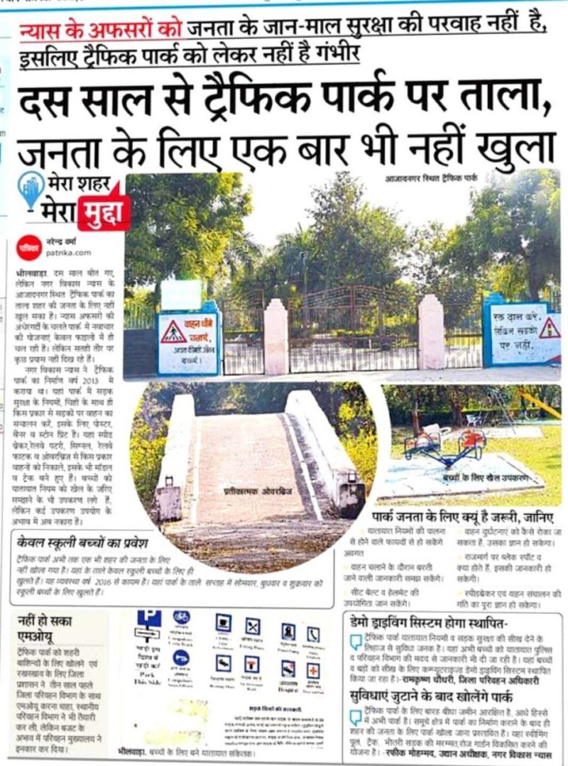 शहर में न्यास की तरफ से विकसित ट्रैफिक पार्क आम जनता के लिए दस साल से नहीं खुल सका है। राजस्थान पत्रिका ने 16 दिसम्बर 2023 के अंक में दस साल से ट्रैफिक पार्क पर ताला, जनता के लिए एक बार भी नहीं खुला शीर्षक से समाचार प्रकाशित कर शहर की जनता व पार्क की बदहाली बयां की थी।