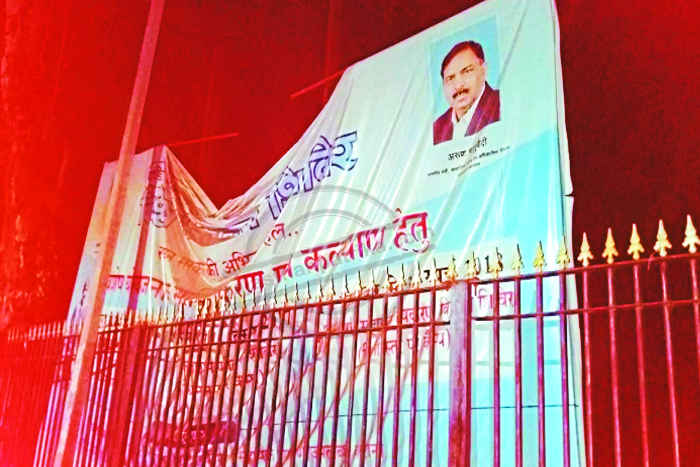 जिला कलक्ट्रेट में मंत्रियों व योजनाओं के बैनर पोस्टर लग रहे हैं।