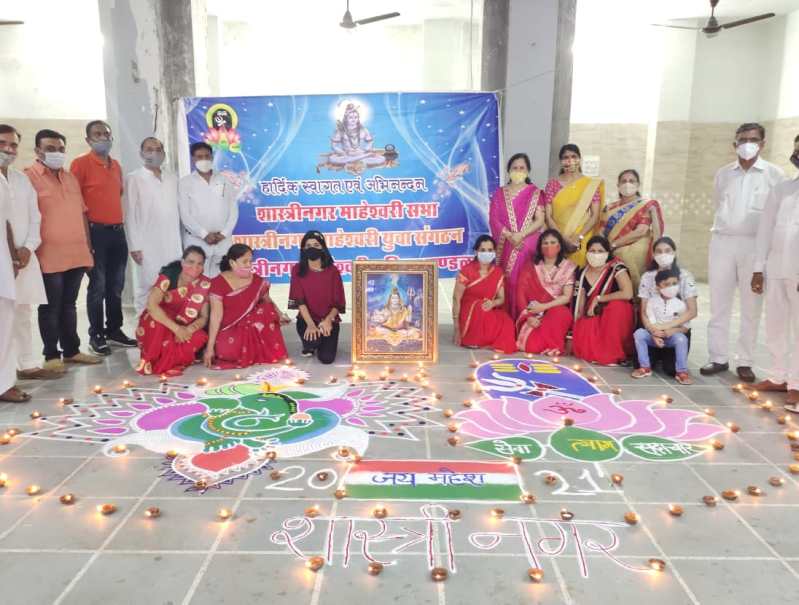 शास्त्री नगर माहेश्वरी सभा एमहिला मंडल, युवा संगठन के तत्वाधान शास्त्री नगर के 5 प्रमुख चौराहे साय 7 बजते ही जगमगा उठे माहेश्वरी समाज की उत्पत्ति दिवस महेश नवमी 2021 के उपलक्ष पर समाज जन ने अपने अपने घरों पर भगवान महेश का अभिषेक कर गोधूलिक बेला में घरों के बाहर एव चौराहों पर दीप प्रज्वलन कर रंगोली बनाई