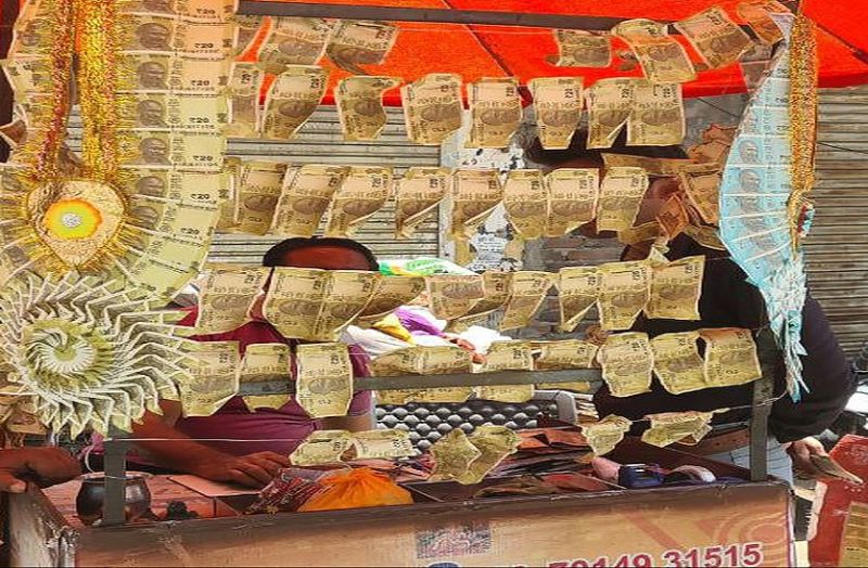 भीलवाड़ा. शादी-ब्याह में नए नोट की मांग आज भी बरकरार है। यह बात अलग है कि हर किसी को नए नोट मिल नहीं पाते। नए नोट की एक गड्डी के लिए भी भारतीय रिजर्व बैंक (आरबीआई) के बाहर कतार लगानी पड़ती है, फिर भी नोट मिल जाए, जरूरी नहीं है। भीलवाड़ा शहर के मुख्य बाजार में आधा दर्जन काउंटर ऐसे लगे हैं, जहां फटे-पुराने नोट बदलने के साथ नए नोटों की कालाबाजारी भी होती है। यहां नोट माला के रूप में सजाकर रखते हैं।