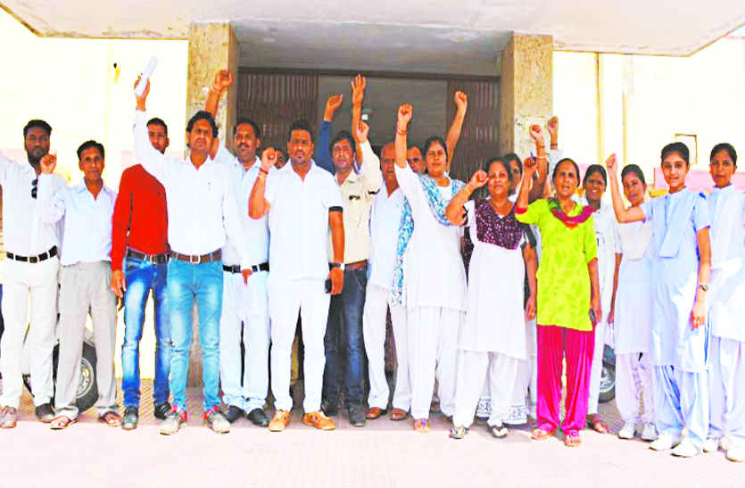 मेडिकल कॉलेज में प्रतिनियुक्ति पर लगे 96 नर्सिंगकर्मियों ने पिछले सात माह से वेतन नहीं मिलने और अब तक सातवें वेतन लागू करने के लिए फिक्सेशन नहीं करने का विरोध जताते हुए सोमवार को काली पट्टी बांधकर विरोध प्रदर्शन किया। कर्मचारियों ने पीएमओ को मेडिकल कॉलेज के प्रिंसिपल के नाम ज्ञापन सौंपा।कर्मचारी मंगलवार को विरोध स्वरूप मुख्यमंत्री के नाम स्वयं के खून से पोस्टकार्ड लिखकर वेतन दिलाने व फिक्सेशन करवाने की मांग रखेंगे।