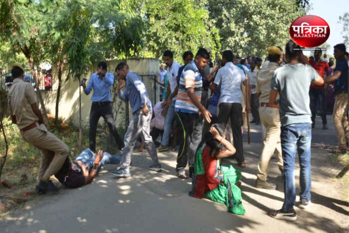 भीलवाड़ा में थाने के बाहर प्रदर्शन कर रहे लोगों को खदेड़़ती पुलिस