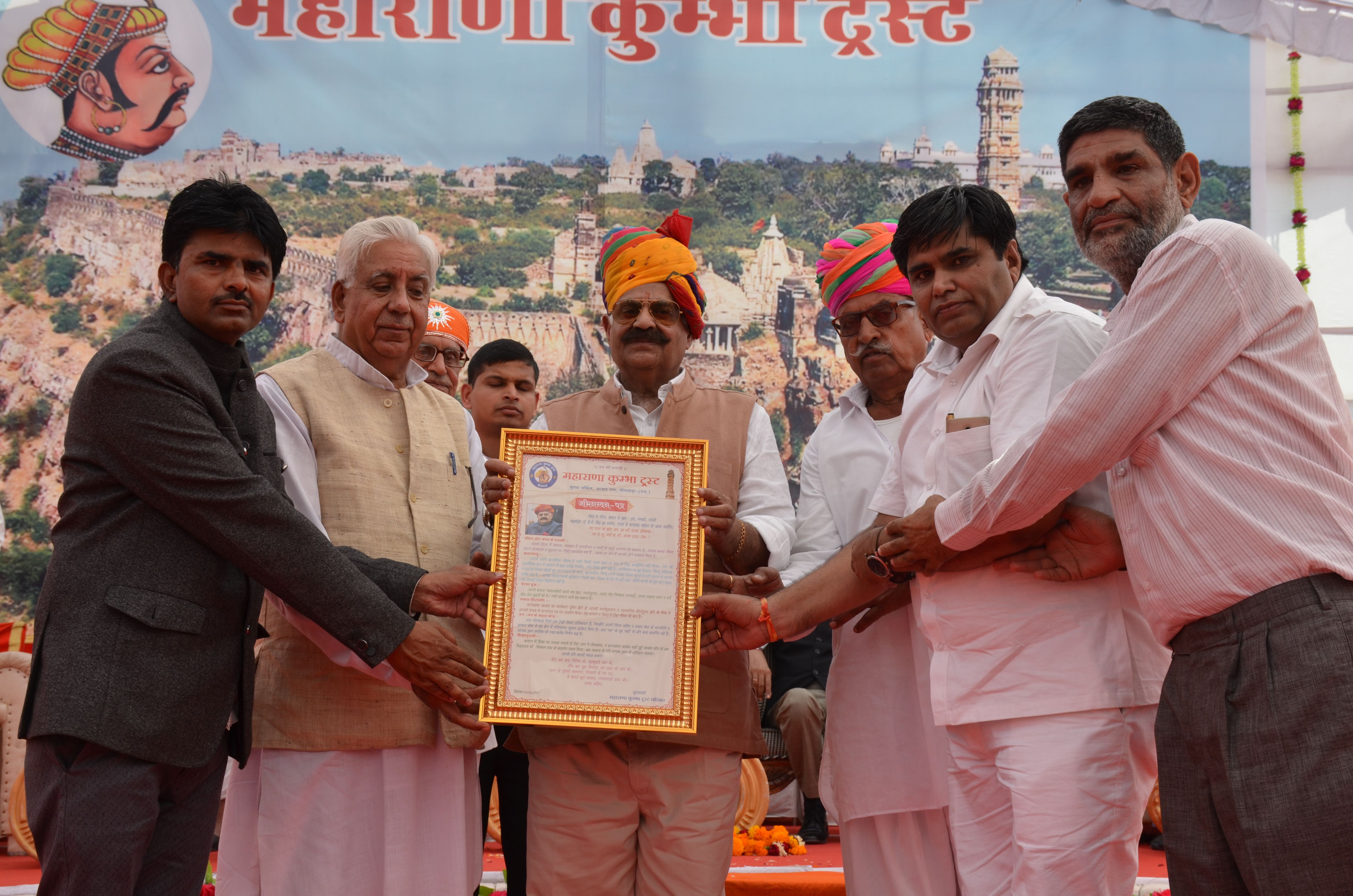 उन्होंनें बेटियों को भी पढ़ाने एवं आगे बढ़ाने का आह्वान किया। समारोह की अध्यक्षता राजस्थान उच्च न्यायालय के न्यायाधीश रामचन्द्रसिंह झाला ने की। विशिष्ट अतिथि जिला प्रमुख शक्तिसिंह हाडा, रॉयल राजपूत विकास परिषद के संस्थापक मेघराज सिंह, मेवाड़ क्षत्रिय महासभा के अध्यक्ष बालूसिंह कानावत एवं महासभा के जिलाध्यक्ष प्रदीपकुमार सिंह सिंगोली थे। हेमेन्द्रसिंह ने पढ़ा अभिनंदन पत्र समारोह में कुंभा ट्रस्ट के संरक्षक व पूर्व सांसद हेेमेन्द्रसिंह बनेड़ा ने ट्रस्ट की ओर से राज्यपाल वीपी सिंह को भेंट अभिनंदन पत्र पढ़ा।