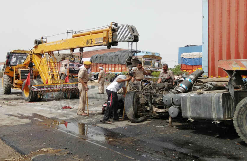 पुलिस के अनुसार संगम फैक्ट्री के निकट देर रात खाखले से भरा ट्रक पलट गया। इससे खाखला सड़क पर बिखर गया। मौके पर पहुंची पुलिस ने हाइवे को वन-वे कर रखा था। वन-वेन पर भीलवाड़ा से अजमेर ? की ओर जा रहा कंटेनर सामने से आ रहे ट्रेलर से भिड़ गया। दुर्घटना इतनी भीषण थी कि टे्रलर के परखच्चे उड़ गए। टे्रलर चालक अंगरावली (भरतपुर) निवासी ताहिर मेव (38) की मौके पर ही मृत्यु हो गई जबकि खलासी सेमलाकला (भरतपुर) निवासी नासिर खान (21) घायल हो गया।