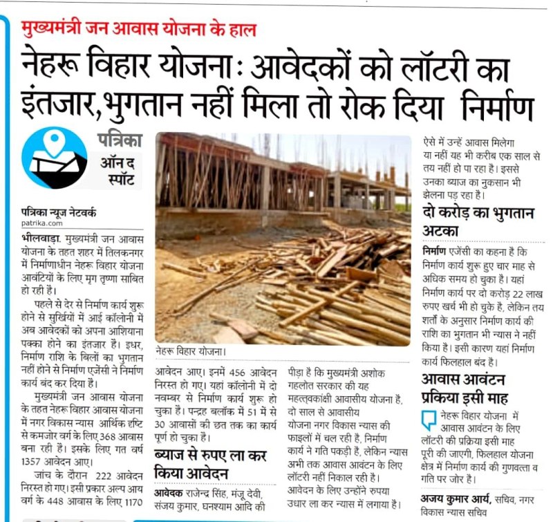 राजस्थान पत्रिका ने 4 अप्रेल 2022 को नेहरू विहार योजना में आवेदकों को लॉटरी का इंतजार शीर्षक से समाचार प्रकाशित किया था। समाचार के जरिए खुलासा किया था कि मुख्यमंत्री जन आवास योजना में शहर में तिलकनगर में निर्माणाधीन नेहरू विहार योजना पहले से देर से निर्माण कार्य शुरू होने एवं एक वर्ष पूर्व आवेदन मांगे जाने के बावजूद आवास लॉटरी नहीं निकाली जा रही है। The wait for the applicants of Nehru Vihar Yojana in Bhilwara is over