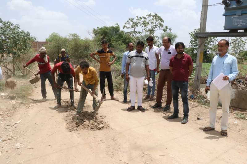 छिंगे सिंह का पुरा में नल जल के लिए लाइन खुदवाते अधिकारी।