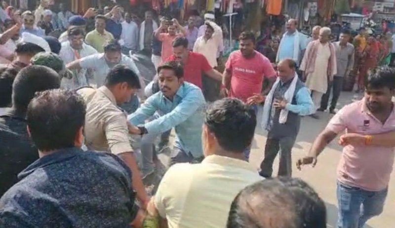 पुतले के लिए छीना-झपटी करती पुलिस व कांग्रेसजन