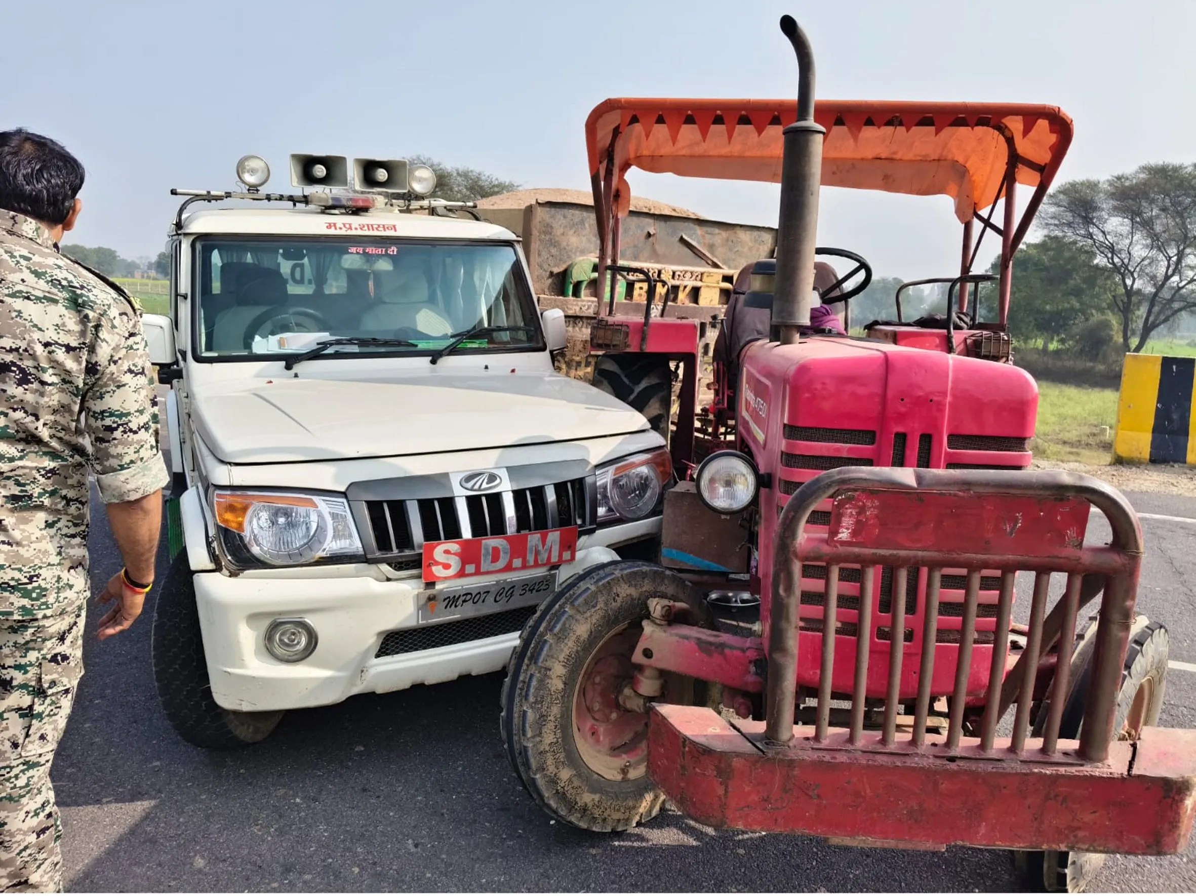 जानकारी के मुताबिक लहार एसडीएम विजय सिंह यादव सोमवार सुबह करीब 11 बजे टीएल बैठक में शामिल होने के लिए लहार से भिण्ड आ रहे थे। एसडीएम ने मिहोना बायपास पर रेत से भरे ट्रैक्टर-ट्राली देखे तो गाड़ी रोक ली। दो ट्रैक्टर-ट्राली ओवरलोड भरे हुए थे। एसडीएम ने उन्हें रोकने की कोशिश की तो एक ड्राइवर रोड पर ट्रैक्टर खड़ा करके भाग गया, वहीं दूसरे ने कार्रवाई से बचने के लिए भागने की फिराक में एसडीएम की गाड़ी में टक्कर मार दी। घटना के बाद एसडीएम ने मिहोना थाना टीआइ विजय कैन को फोन कर पुलिस बल बुलाया। पुलिस और राजस्व विभाग की टीम ने घेराबंदी कर दोनों ट्रैक्टर-ट्राली को पकड़ लिया और थाने में खड़ा करवाया। पुलिस ने आरोपी चालक 30 वर्षीय पिंटू जाटव पुत्र महेश जाटव वार्ड चार खितौली और सोनू पुत्र महेश जाटव के खिलाफ प्रकरण दर्ज कर आरोपियों की तलाश शुरू कर दी है।