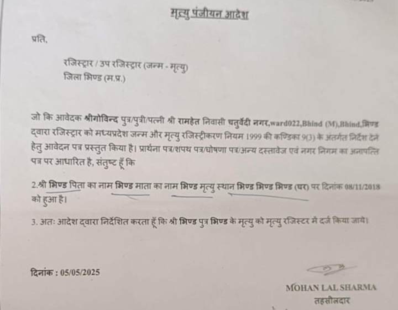 भिंड में बुधवार को तहसीलदार द्वारा जारी किया गया एक मृत्यु प्रमाण पत्र वायरल हुआ जिसपर मरने वाले का नाम 'भिंड' लिखा है। निवासी और स्थान भी 'भिंड' ही लिखा है।