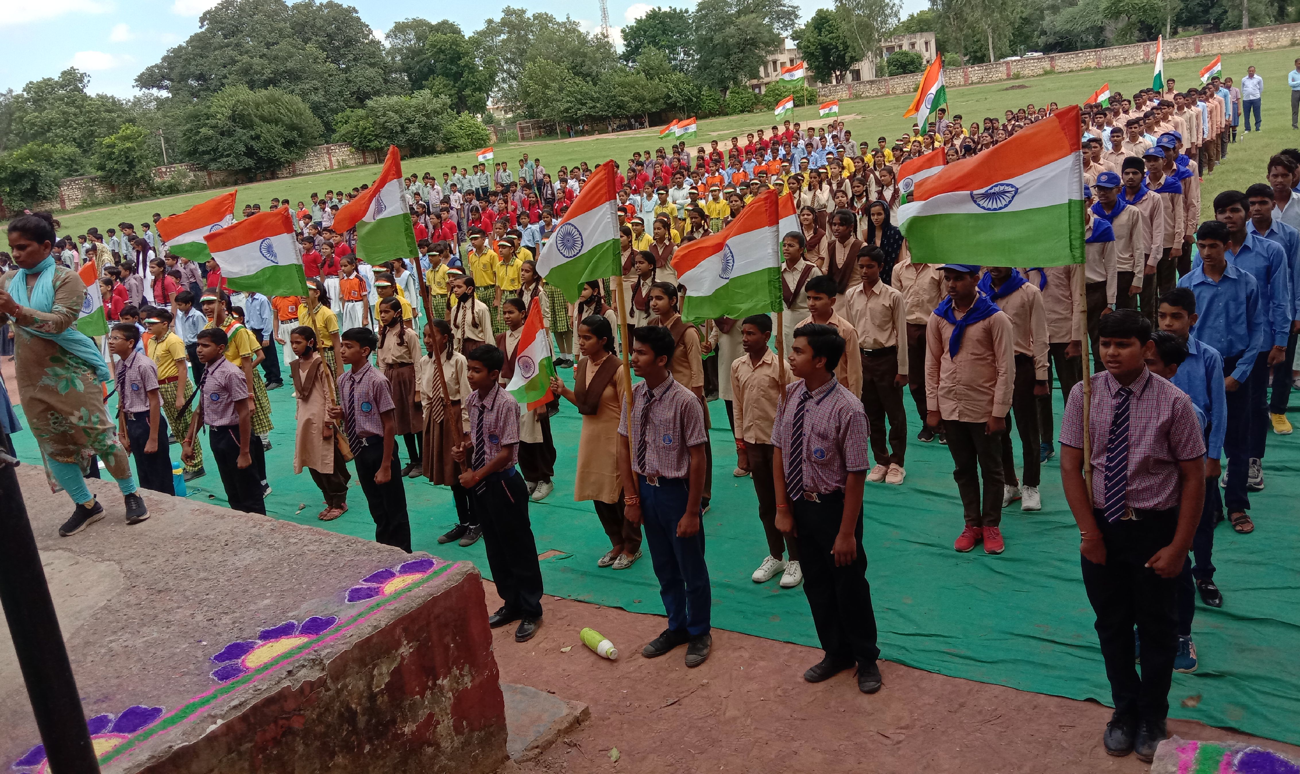 तिजारा. आजादी के अमृत महोत्सव के तहत देशभक्ति समारोह में उपस्थित स्कूली बालक, मौजूद अतिथि व अन्य।
