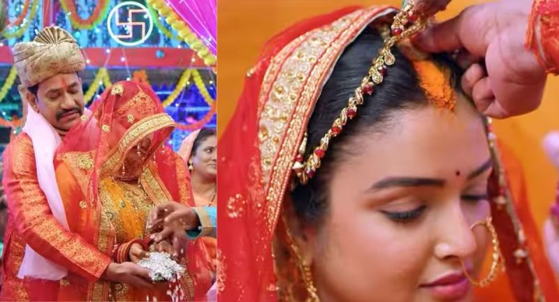 निरहुआ उर्फ दिनेश लाल यादव भोजपुरी सुपरस्टार आम्रपाली की मांग में सिंदूर भरते दिख रहे हैं। शादी की सोशल मीडिया पर आम्रपाली दुबे और निरहुआ उर्फ दिनेश लाल यादव की कुछ तस्वीरें वायरल हो रही हैं ।जिसमें आम्रपाली दुल्हन और निरहुआ दूल्हा बने नजर आ रहे हैं।