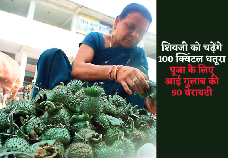 राजधानी में मंदिरों के बाहर धतूरा,बेलपत्र और मदार की थाली 10 रुपए में बिक रही है। भोपाल के आसपास के गांवों, रायसेन और सीहोर के ग्रामीण क्षेत्रों से धतूरा बिकने के लिए आया है। शहर के व्यवसायियों का कहना है सिर्फ शिवरात्रि पर हरा धतूरा सौ से ज्यादा का बिक जाता है।