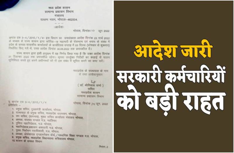 बता दें कि कोरोना महामारी के कारण सरकार ने सरकारी दफ्तरों में 5 डे वर्किंग का निर्णय लिया था। जिसके बाद से सरकारी दफ्तरों में सोमवार से शुक्रवार तक सरकारी कामकाज हो रहे थे। कोरोना की पाबंदियां खत्म होने के बाद 23 मार्च 2022 को सरकार की ओर से एक आदेश इस संबंध में जारी किया गया था और 30.06.2022 तक 5 डे वर्किंग को जारी रखने का निर्णय लिया था जिसके बाद अब आदेश के खत्म होने से पहले ही मध्यप्रदेश सरकार ने एक बार फिर 31 दिसंबर 2022 तक सरकारी दफ्तरों में 5 डे वर्किंग का नया आदेश जारी किया है।