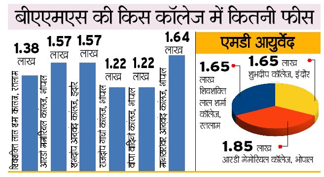 भोपाल. राजधानी में बीएएमएस और एमडी आयुर्वेद की पढ़ाई सबसे महंगी हो गई है। एडमिशन एंड फीस रेग्युलेटरी कमेटी ने आयुष कॉलेजों की सालाना फीस में 30 फीसदी का इजाफा कर दिया है। यह फीस 2016-17, 2017-18 एवं 2018-19 सत्र के लिए लागू होगी। कमेटी की बुधवार को हुई बैठक के बाद नई फीस गाइडलाइन जारी की गई। इसमें बीएएमएस और एमडी कोर्स में भोपाल के कॉलेज सबसे महंगे हैं। मानसरोवर आयुर्वेदिक कॉलेज में बीएएमएस की फीस एक लाख 64 हजार रुपए, जबकि आरडी मेमोरियल कॉलेज में 1.85 लाख रुपए सालाना चुकाने होंगे।
