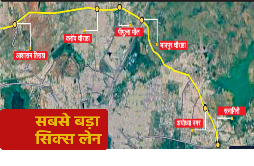 अयोध्या बायपास की मौजूदा फोर लेन को अब सिक्स लेन किया जाएगा। आशाराम तिराहा से रत्नागिरी तक 16.44 किमी लंबे इस सिक्स लेन का लाभ अयोध्या बायपास से लेकर नीलबड़ तक की 200 से ज्यादा कॉलोनी के पांच लाख लोगों को मिलेगा। वहीं कानपुर से सीधा आवागमन जुड़ेगा, इससे गोविंदपुरा इंडस्ट्रियल एरिया में रोजाना आने वाले सात सौ से ज्यादा भारी वाहनों की राह आसान होगी, बैरागढ़ के कपड़ा और बर्तन कारोबारियों को बड़ी राहत मिलेगी। इस रूट से रेलवे स्टेशन और एयरपोर्ट जाने वालों के भी समय की बचत होगी। 16 किमी की सड़क पर आठ फ्लाईओवर, एक आरओबी भी प्रस्तावित है। इसके लिए 97.79 हेक्टेयर जमीन की आवश्यकता है, प्रशासन इसका अधिग्रहण करेगा, ज्यादातर जमीनें निजी आ रही हैं।