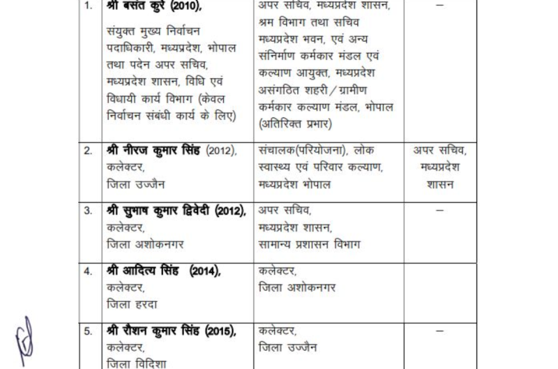 इंदौर कलेक्टर आशीष सिंह को सिंहस्थ मेला उज्जैन के मेला अधिकारी के रूप में अतिरिक्त प्रभार सौंपा गया है। संयुक्त मुख्य निर्वाचन पदाधिकारी बसंत कुर्रे को श्रम विभाग में अपर सचिव नियुक्त किया गया है।