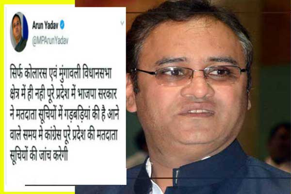 अरुण यादव ने अपने ट्विट में लिखा है कि 'सिर्फ कोलारस एवं मुंगावली विधानसभा क्षेत्र में ही नहीं, पूरे प्रदेश में भाजपा सरकार ने मतदाता सूचियों में गड़बड़ी की है,आने वाले समय में कांग्रेस पूरे प्रदेश की मतदाता सूचियों की जांच करेगी।