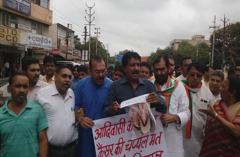 दरअसल मध्यप्रदेश की राजधानी भोपाल में सोमवार सुबह करीब 11 बजे, छ: नंबर बस स्टॉप पर विरोध प्रदर्शन किया गया। यह विरोध MP भाजपा सरकार द्वारा तेंदूपत्ता संग्राहकों को पहनाएं गए जूतों चप्पलों में खतरनाक रसायन होने के चलते किया गया।