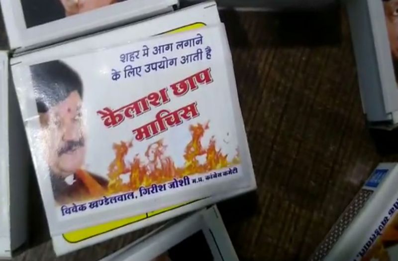 मध्यप्रदेश कांग्रेस कमेटी के नेता विवेक खण्डेलवाल और गिरीश जोशी ने कैलाश छाप माचिस को लॉन्च किया है। उस माचिस पर लिखा है कि शहर में आग लगाने के लिए उपयोग आती है। कैलाश छाप माचिस का वीडियो और तस्वीर अब सोशल मीडिया पर काफी वायरल है। वहीं, कांग्रेस के कार्यकर्ता ने भी इस ब्रांड को लेकर कई जगह प्रदर्शन कर रहे हैं।