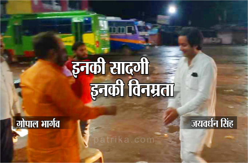 सादगी के लिए ख्यात गोपाल भार्गव जब बस स्टैंड पर अपने साथियों के साथ बैठे थे, तभी वहां से नगरीय प्रशासन मंत्री जयवर्धन सिंह का काफिला गुजर रहा था। जयवर्धन सिंह ने देखा कि नेता प्रतिपक्ष गोपाल भार्गव बस स्टैंड पर बैठे नजर आ रहे हैं, तो उन्होंने अपना काफिला तुरंत रुकवाया और उनके पास पहुंच गए। जयवर्धन भी अपने विरोधियों और बड़ों का आदर और विनम्र स्वभाव के लिए जाने जाते हैं। पूर्व मुख्यमंत्री दिग्विजय सिंह के बेटे जयवर्धन सिंह ने भार्गव के चरण छूकर आशीर्वाद लिया। दोनों साथ बैठे और ढेर सारी बातें कीं। गोपाल भार्गव ने भी बस स्टैंड पर बने नगर निगम भवन की काफी सराहना की। इस दौरान काफी देर तक ठहाके भी लगते रहे। यह नजारा देख बस स्टैंड पर काफी लोग एकत्र हो गए थे, वे दोनों नेताओं को कैमरे में कैद करने लगे और सेल्फी लेने लगे। दोनों ही दिग्गजों की यह सहज, विन्रम मुलाकात काफी चर्चित हो रही है।