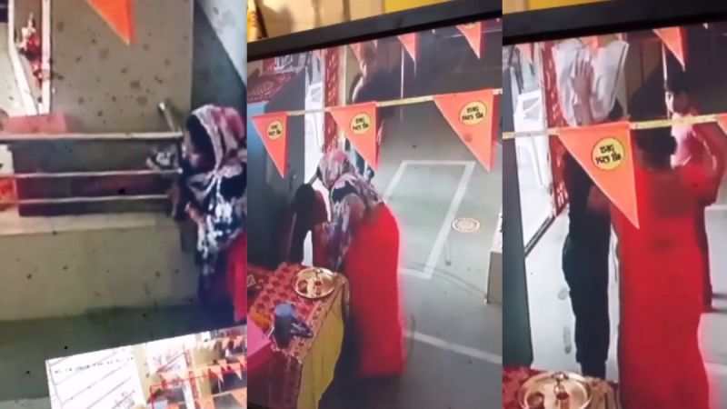 एक महिला अपने दोनों बच्चों के साथ मंदिर से दानपेटी चुरा रही है