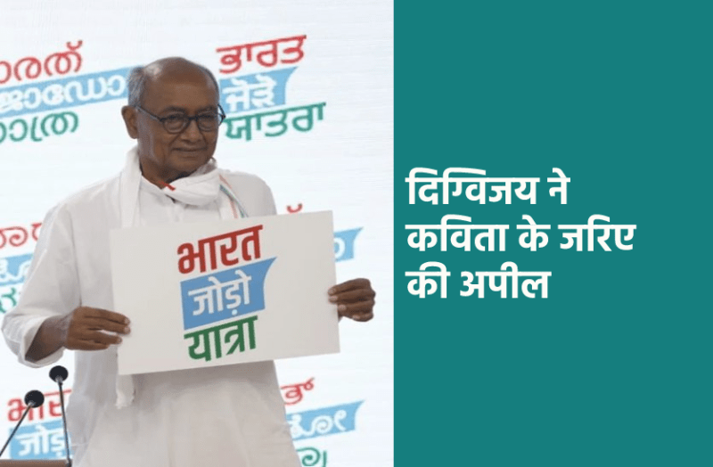 पूर्व मुख्यमंत्री एवं राज्य सभा सांसद दिग्विजय सिंह ने शनिवार को अलग ही अंदाज में कांग्रेस की भारत जोड़ो यात्रा से जुड़ने का आव्हान किया है। उन्होंने सोशल मीडिया पर कविता के अंदाज में अपील की है। उन्होंने ट्वीट पर भी इसे शेयर किया है।