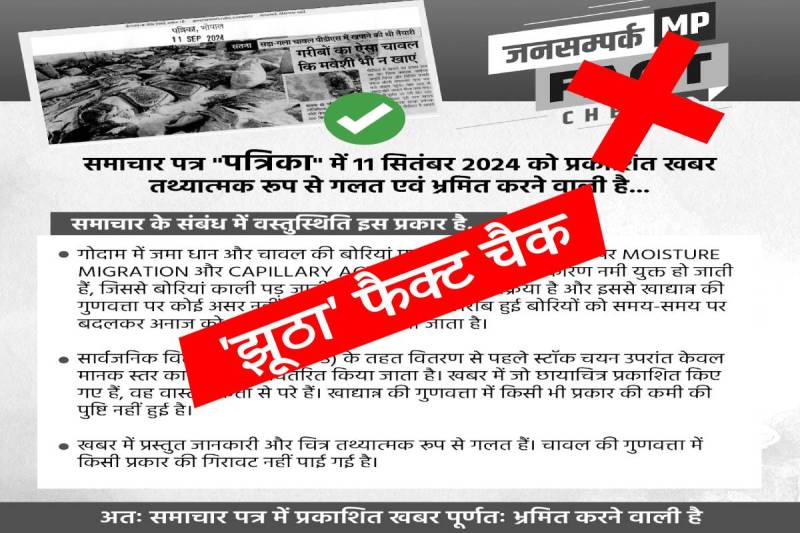 सुबह पत्रिका की खबर प्रकाशित हुई और चंद घंटों बाद ही विभाग के अधिकारियों ने इसे लेकर झूठ परोसना शुरू कर दिया। खबर का फैक्ट चैक कर बकायदा गलत का ठप्पा लगाकर सोशल मीडिया पर ये परोसा गया कि ये खबर झूठी है। पत्रिका की खबर को गलत बताते हुए फैक्ट चैक के नाम पर जनसंपर्क विभाग ने ऑफिशियल X अकाउंट से ट्वीट किया कि ये खबर गलत है। हैडिंग दी गई समाचार पत्र "पत्रिका" में 11 सितंबर 2024 को प्रकाशित खबर "गरीबों का ऐसा चावल की मवेशी भी न खाएं" के सम्बन्ध में वस्तु स्थिति..यह समाचार पूर्णतः भ्रामक, असत्य एवं तथ्यहीन है।
