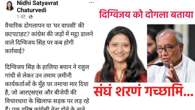 कांग्रेस नेत्री निधि चतुर्वेदी ने दिग्विजय सिंह Digvijay Singh के विरुद्ध कड़ी अनुशासनात्मक कार्रवाई करने की मांग की। उनके RSS संबंधी बयान को लेकर फेसबुक पोस्ट में निधि चतुर्वेदी ने कहा कि इससे पार्टी की वैचारिक लड़ाई कमजोर हुई, जमीनी कार्यकर्ताओं का मनोबल टूटा है।